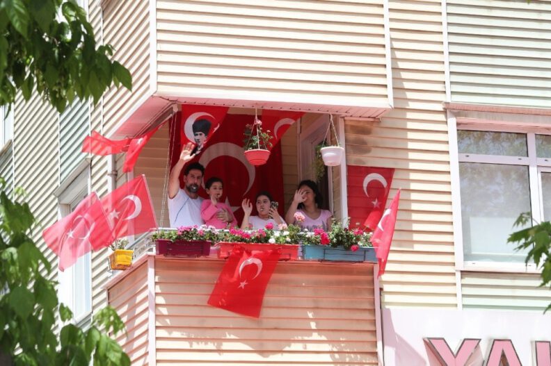 19 Mayıs Atatürk’ü Anma Gençlik ve Spor Bayramı coşkusu ile ilgili konuşan Başkan Gökhan Yüksel, “Gazi Mustafa Kemal Atatürk, umutsuz bir toplumu, işgal edilmiş Anadolu’yu Samsun’a çıkarak ve arkadaşlarıyla beraber örgütleyerek Türkiye Cumhuriyeti’ni kurdu ve bugünlere kadar gelen bir temel attı. Bizler de, genç yöneticiler olarak bu Cumhuriyetin daha ileri noktaya gidebilmesi, bayrağı daha yukarı çıkarmak için azimle çalışıyoruz. Bugün de milli bayramımız. Bütün komşularımızın bu milli bayramı coşkuyla kutlayabilmeleri için elimizden gelen gayretimizle çalışıyoruz. Sokaklarda ve caddelerde etkinliklerimiz devam edecek. Korona virüs sürecinde moraller bozuk ama umudumuzu kaybetmedik, bu süreci de atlatacağız. Milli Bayramlarımız bizim kırmızı çizgimiz. Yaklaşık 11 yıldır bu meydandan Kartal Meydanı’na doğru on binlerce komşumuzla birlikte yürüyüş gerçekleştiriyorduk. Korona virüs bu yıl fırsat vermedi ama bizler temsili olarak komşularımızla yan yana olduğumuzu, milli bayramımızı coşkuyla kutladığımızı göstermek istiyoruz. Onlar da bize balkonlarından eşlik ediyorlar. Herkesin 19 Mayıs Atatürk’ü Anma, Gençlik ve Spor Bayramı’nı kutluyorum” dedi.