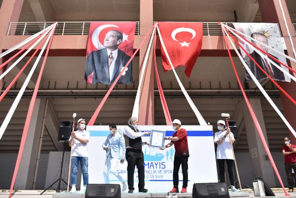 Rekor Tescil ve Hakem Heyeti Başkanı Prof. Dr. Orhan Kural da 19 Mayıs ruhunu yaşatan bu rekoru dünyanın dört bir tarafındaki gençlik adına kırmanın mutluluğunu yaşadıklarını dile getirerek, bu anlamlı çalışma için Tuzla Belediyesi Başkanı Dr. Şadi Yazıcı’ya teşekkür etti.