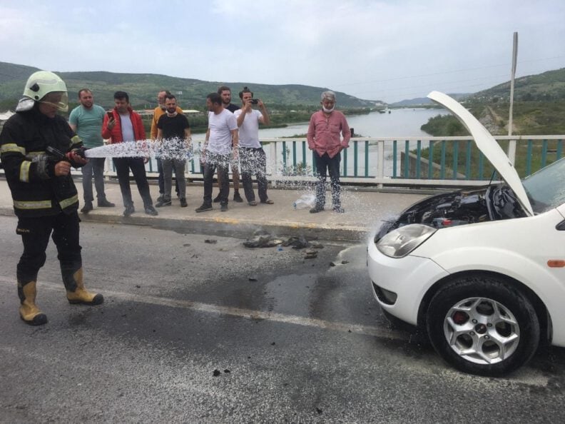 Öte yandan Çaycuma köprüsü üzerinde hareket halinde olan bir aracın daha motor kısmından dumanlar çıktı. Sürücü O.D. ait otomobilinden dumanların çıkmasıyla aracını köprü üzerinde kenara çekip yangın tüpüyle söndürmeye çalıştı. Sebebi henüz bilinmeyen bir nedenle alev alan araca Çaycuma itfaiye ekipleri de müdahelede bulundu. İki otomobilde de maddi hasar meydana geldi.