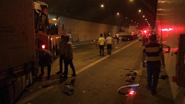 Alişan KOYUNCU/İZMİT (Kocaeli), (DHA)- İZMİT’te, TEM Otoyolu Korutepe Tüneli’nde, bir TIR’ın yavaşlaması sonucu zincirleme kaza meydana geldi. 5 TIR’ın karıştığı kaza nedeniyle TEM Otoyolu’nun Ankara istikameti ulaşıma kapandı.