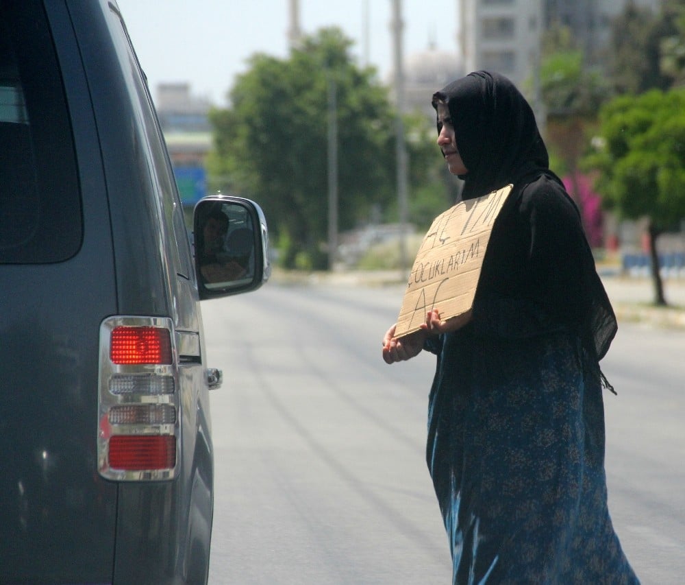 Adana’da bir kadın, kırmızı ışıkta duran araçlar arasında üzerinde “Açım çocuklarım aç” yazılı kartonu göstererek dilencilik yapıyor.