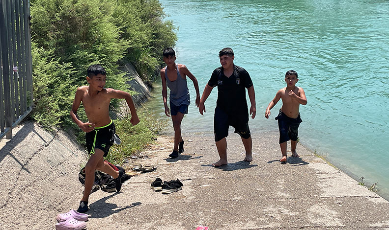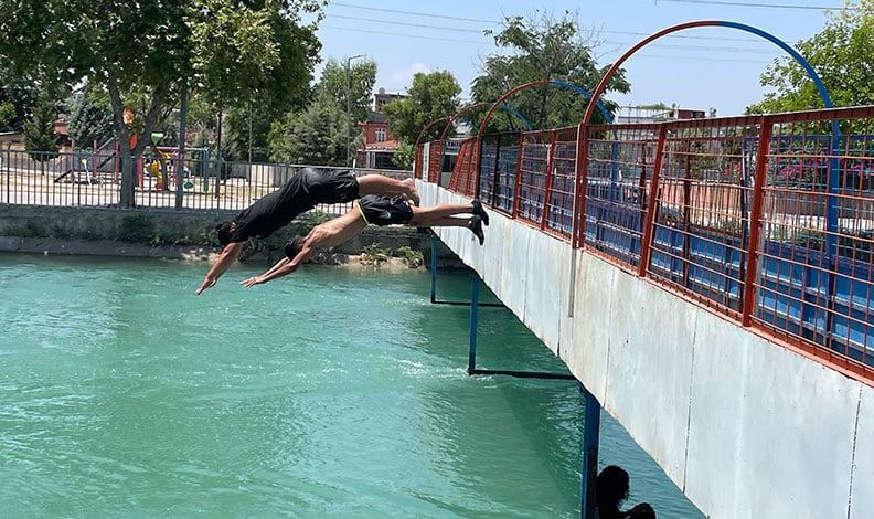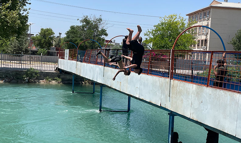 Tüm zamanların en sıcak haziran ayının yaşandığı Adana’da sıcaktan bunalan çocuklar sulama kanallarına akın etti. Nem ile birlikte hissedilen sıcaklığın yaklaşık 50 dereceye ulaştığı kentte, Yüreğir ilçesinde bulunan sulama kanalına giren çocuklar yüzerek serinledi. Yüzme öncesinde kanal üzerindeki köprüden akrobatik hareketler yaparak sulama kanalına atlayan çocukların attığı taklalar ise yürekleri ağızlara getirdi. Kanalda yüzerken boğulmaktan korkmadıklarını ifade eden çocuklar köprüden atlarken adeta uçtuklarını belirterek, “Biz de Adana havayollarıyız” şeklinde konuştu.