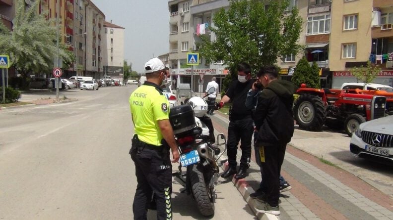 İnegöl’de iki Suriye uyruklu genç motosikletleriyle alışverişe çıkmaları pahalıya patladı. Polis ekipleri tarafından durdurulan motosiklet sürücüsünün ehliyeti olmadığı fark edildi. Şahsa ehliyetsiz motosiklet kullanmaktan ve sokağa çıkma yasağını ihlal etmekten dolayı 4 bin 500 TL para cezası kesilirken, yanında bulunan şahsa da kısıtlama uymadığından dolayı 3 bin TL ceza kesti.