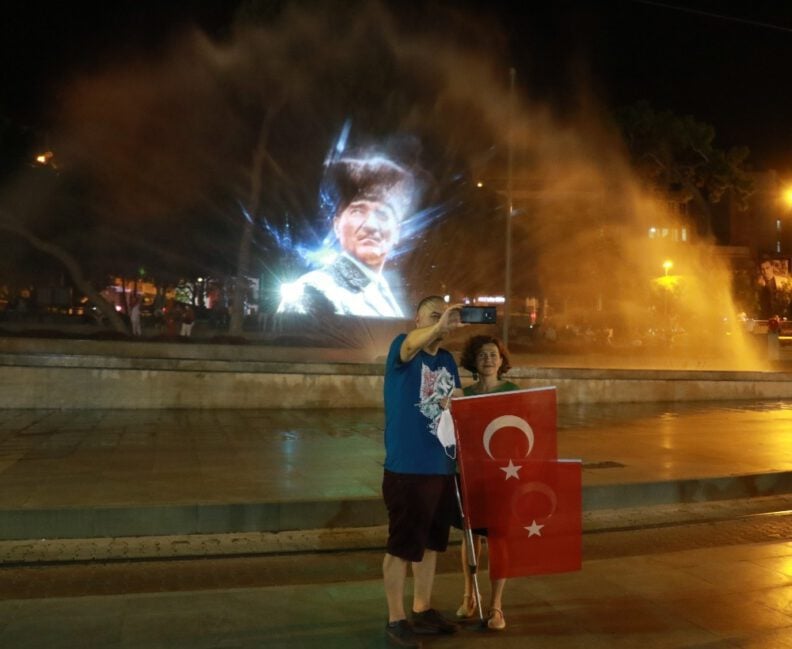 Cumhuriyet Meydanı’nda da tören düzenlendi. Programa katılanlar meydanda sosyal mesafelerini koruyarak, İstiklal Marşı’nı okudu. Günün anlam ve önemine uygun şarkılar eşliğinde meydanda bulunan fıskiyede Türk bayrağı ve Atatürk’ün silueti oluşturuldu.