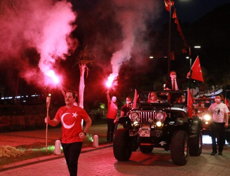 Antalya’da her 29 Ekim ve 19 Mayıs’ta on binlerce vatandaşın katılımıyla düzenlenen fener alayı, bu yıl korona virüs nedeniyle sadece yerel yönetim temsilcilerinin ve sporcuların katılımı ile gerçekleşti. Tedbirler nedeniyle alanları dolduramayan vatandaşlardan bazıları balkonlarından ve pencerelerinden bayraklarla kutlamaya eşlik ederken, bazıları ise kaldırımlardan maskelerini takıp Türk bayraklarını sallayarak eşlik etti.
