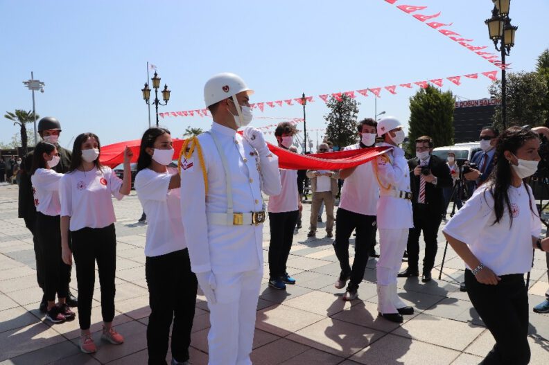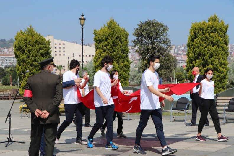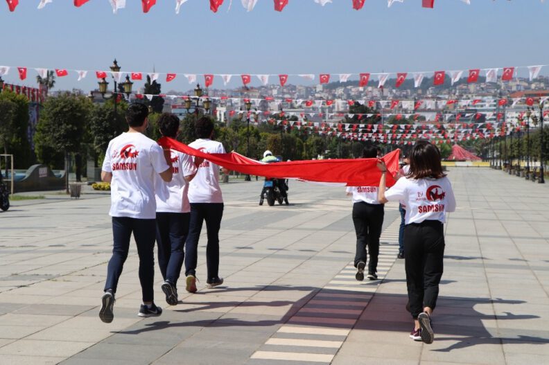 2 denizci ile 2 karacı asker ile birlikte 1 denizci subayın, 19 Mayıs 1919 tarihinde 101 yıl önce Milli Mücadele’yi başlatmak üzere karaya çıkan Mustafa Kemal Atatürk ve silah arkadaşlarının karaya çıkışını canlandırdı. Askerlerin ellerinde karaya çıkarılan Türk bayrağı, Samsun Valisi Osman Kaymak nezaretinde 7 sporcuya teslim edildi. Sporcular da şanlı Türk bayrağını Tütün İskelesi’nden alarak eskort eşliğinde önce Cumhuriyet Meydanı’na, ardından da Atatürk Bulvarı üzerinden Bandırma Vapuru’na ulaştırdı.