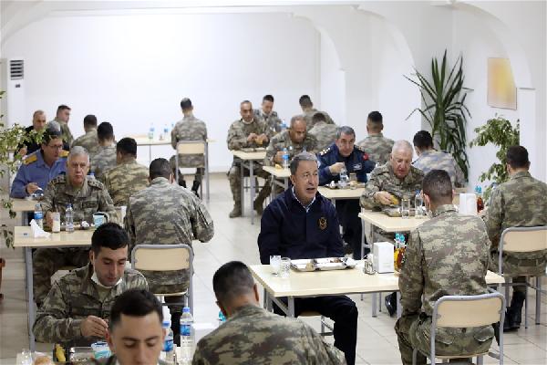 Milli Savunma Bakanı Hulusi Akar beraberinde Genelkurmay Başkanı Orgeneral Yaşar Güler, Kara Kuvvetleri Komutanı Orgeneral Ümit Dündar, Hava Kuvvetleri Komutanı Orgeneral Hasan Küçükakyüz ve Deniz Kuvvetleri Komutanı Oramiral Adnan Özbal ile Suriye sınırının sıfır noktasındaki birliklerdeki inceleme ve denetlemelerinin ardından İdlib’deki faaliyetlerin idare edildiği 2’nci Ordu Taktik Komuta Yeri’ne gitti. Akar ve TSK komuta kademesi burada ramazan ayının son iftarını Suriye’nin kuzeyindeki teröristlere yönelik düzenlenen operasyonlarda görev alan komandolarla yaptı. İftarın ardından Bakan Akar ve komutanlar, İdlib ve Afrin’deki faaliyetlerin yönetildiği Harekat Merkezi’ne geçti. Sahadaki son gelişmelere ilişkin brifing alan, talimatlar veren Bakan Akar, “Çok önemli işler, başarılı görevler yaptınız. Çalışmalarımız, gayretlerimiz devam ediyor. Aynı ciddiyet ve hassasiyetle görevimizi yapmayı sürdüreceğiz” diye konuştu.