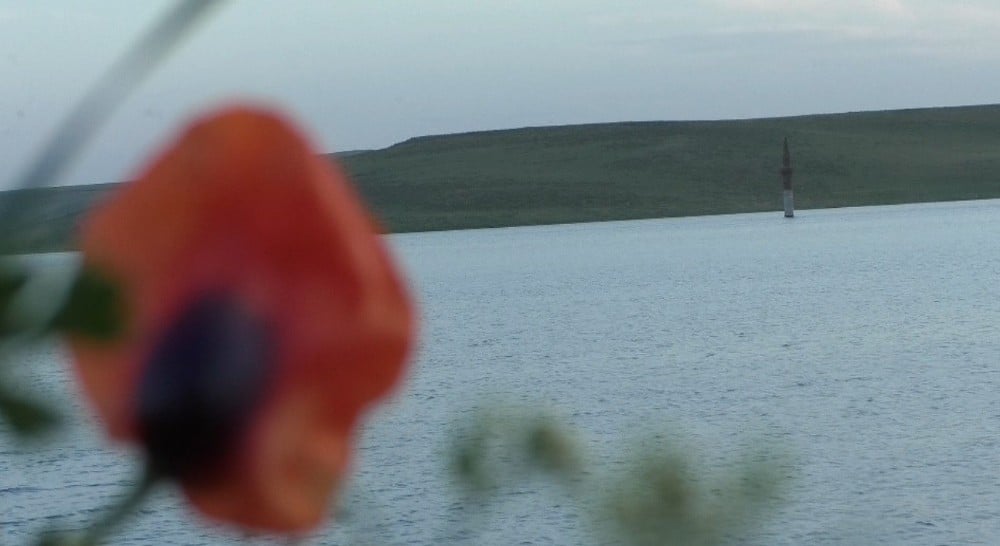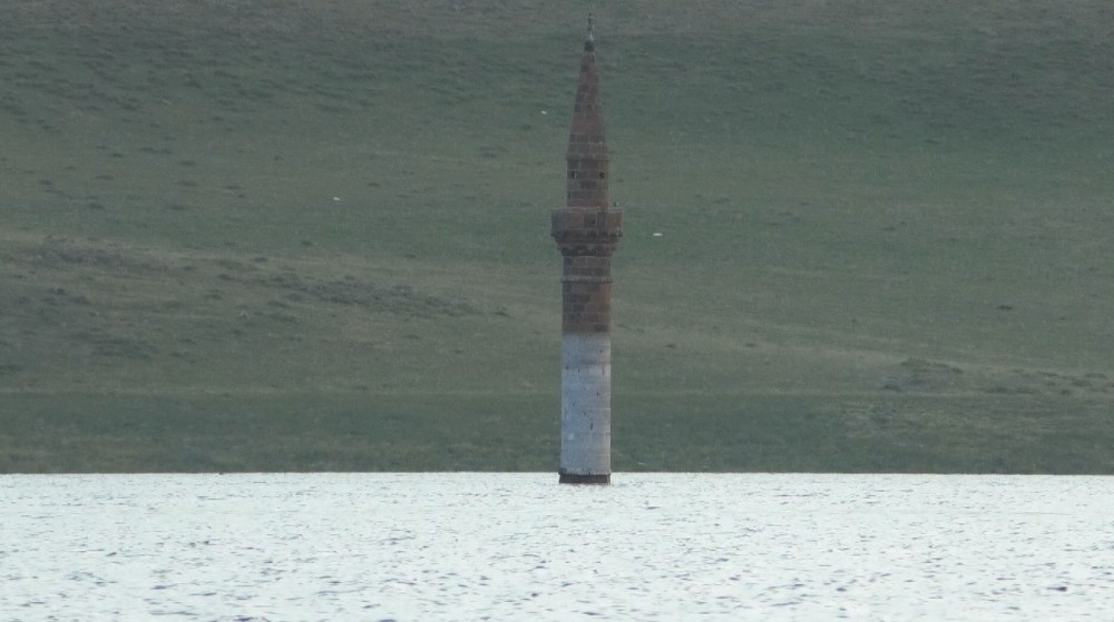 Kars Baraj Gölü’nde kapaklar kapatılınca eski Çamçavuş Köyü yeniden sular altında kaldı. Sular altında kalan köyden geriye sadece cami minaresi kaldı.