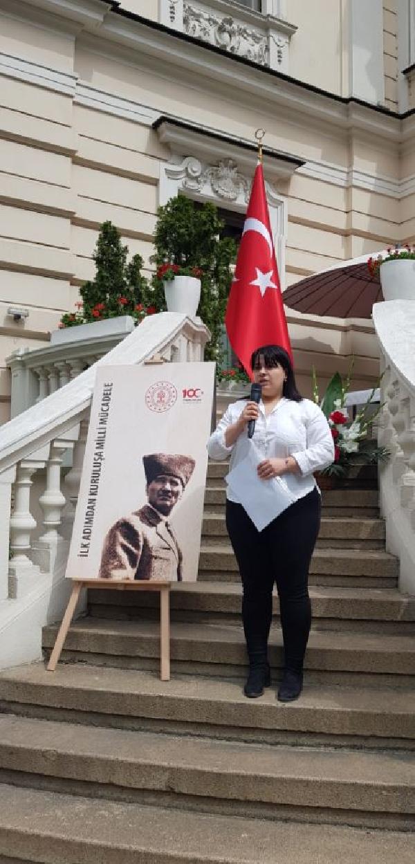 Türkiye’nin Sofya Büyükelçisi Aylin Sekizkök konuşmasında, “Atamız 101 yıl önce bugün Samsun’a çıkmak suretiyle Türk milletinin yeniden var olma mücadelesinin başlangıcını yaptı. İçimizdeki milli direniş ve inancı tekrar uyandırdı, küllerimizden yeniden dirildik. Atatürk’ün askeri ataşelik yaptığı, Birinci Dünya Savaşı’ndan hemen önce 1914 yılında çalıştığı bu konutta 19 Mayıs’ı birlikte kutluyor olmanın ayrı bir önemi, ayrı bir anlamı var” dedi. 19 Mayıs programında Sofya Teknik Üniversitesi Havacılık Mühendisliği Bölümü öğrencisi Merve Çağla Kahraman ‘Gençliğe Hitabe’yi okudu.