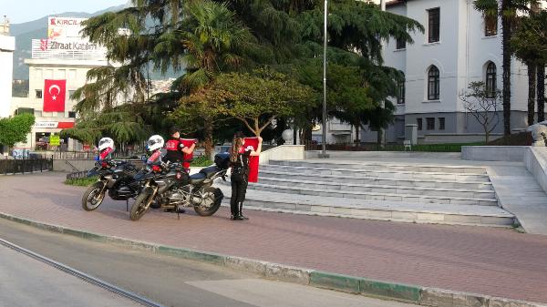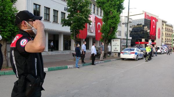 Bursa’da görev başındaki polis memurları saat 19.19’da saygı duruşuna geçip İstiklal Marşı okuyarak 19 Mayıs Atatürk’ü Anma Gençlik ve Spor Bayramı’nın 101’inci yılını kutladı.
