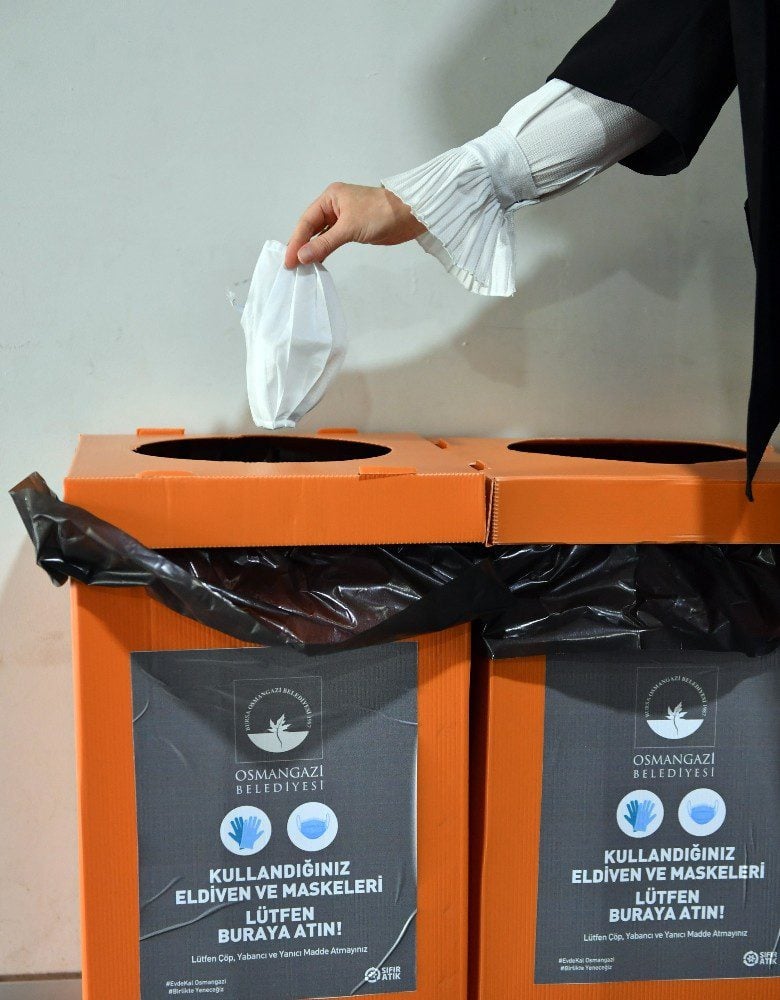 Osmangazi Belediyesi, korona virüsü salgınında en fazla kullanılan sağlık ekipmanları olan maske ve eldivenler için özel atık konteynırları hazırladı.