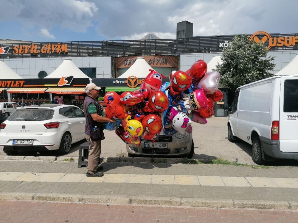 Bursa’da etkili olan şiddetli rüzgar, hayatı olumsuz etkiledi. İnsanlar caddelerde yürümekte zorluk çekerken, esnaf ise kapı önlerindeki malzemelerini içeri almanın telaşına düştü. Eline aldığı birkaç balonu satarak ailesini geçindirmeye çalışan bir vatandaşın ise fırtına ile imtihanı kameralara yansıdı. Elindeki balonların uçmaması için büyük çaba saf eden kişi, oturduğu taburenin ise sürüklenmemesi için ne yapacağını şaşırdı. Bir eliyle balonlar uçmasın diye sıkı sıkı tutan vatandaş, diğer eliyle de taburesine sahip çıktı.