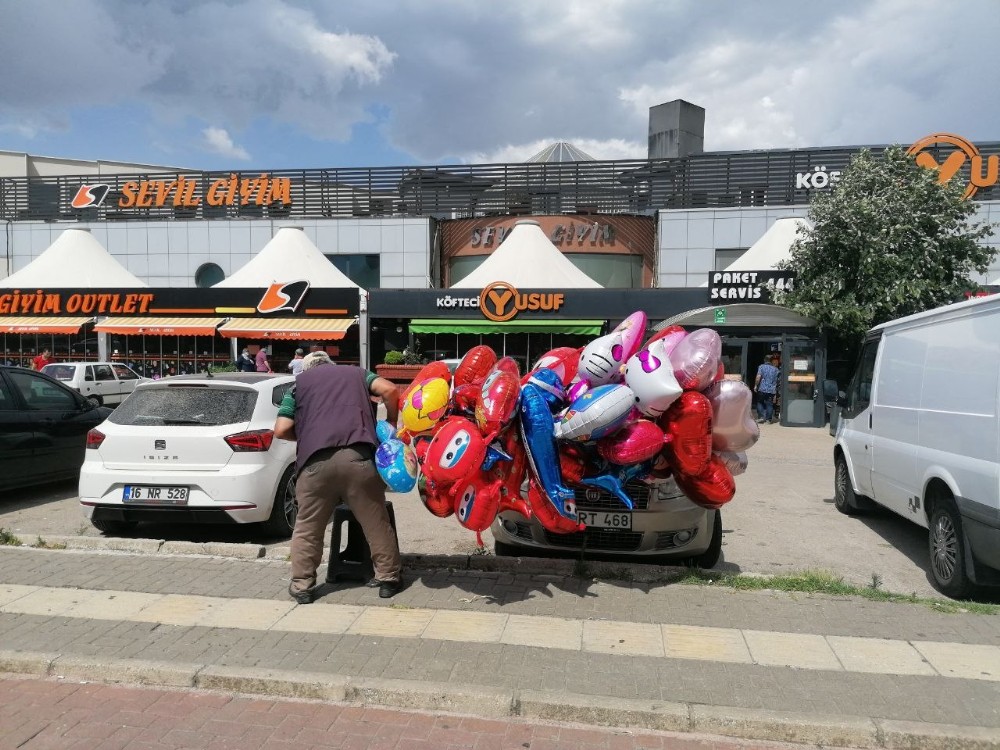 Bursa’da aniden çıkan fırtınada neye uğradığını şaşıran vatandaş, elindeki balonların uçmaması için büyük çaba sarf etti.