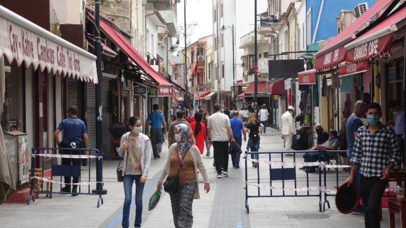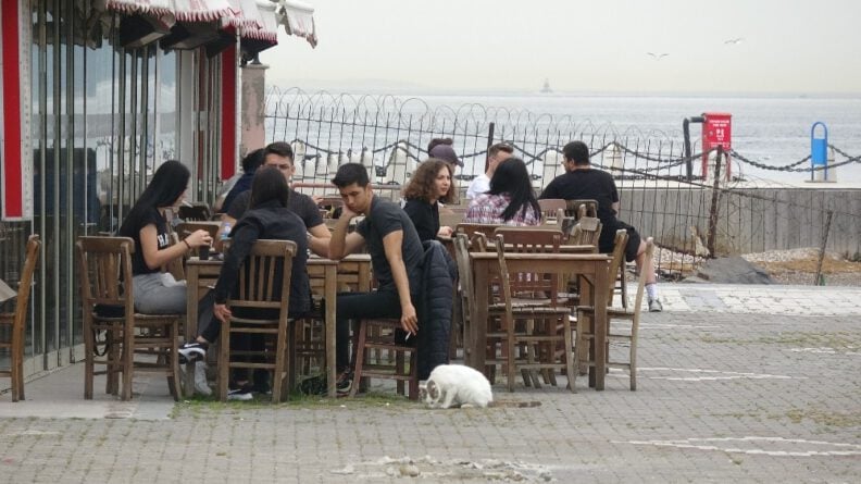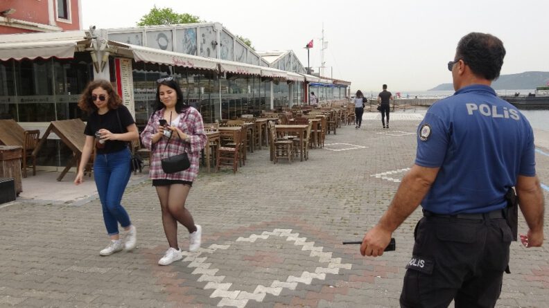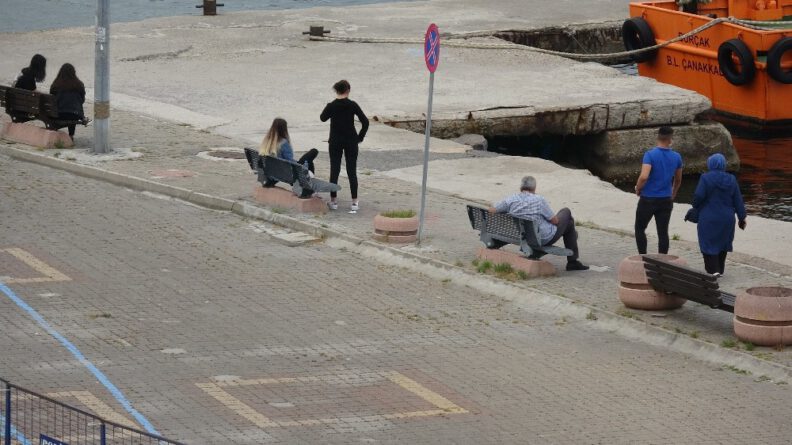 Çanakkale’de sahil kenarlarına akın eden gençler, uzun süredir polis barikatlarıyla kapalı olan kordona girdiler. Kimisi banklarda oturup sohbet ederken, kimisi de yanında yiyecek ve içeceğini getirerek kapalı olan işletmelerin masa ve sandalyelerine oturdular. Bazı kişiler ise korona virüs salgını yokmuş gibi sahilde fotoğraf çekip, yürüyüş yaptı.