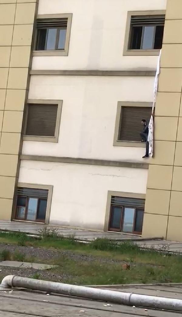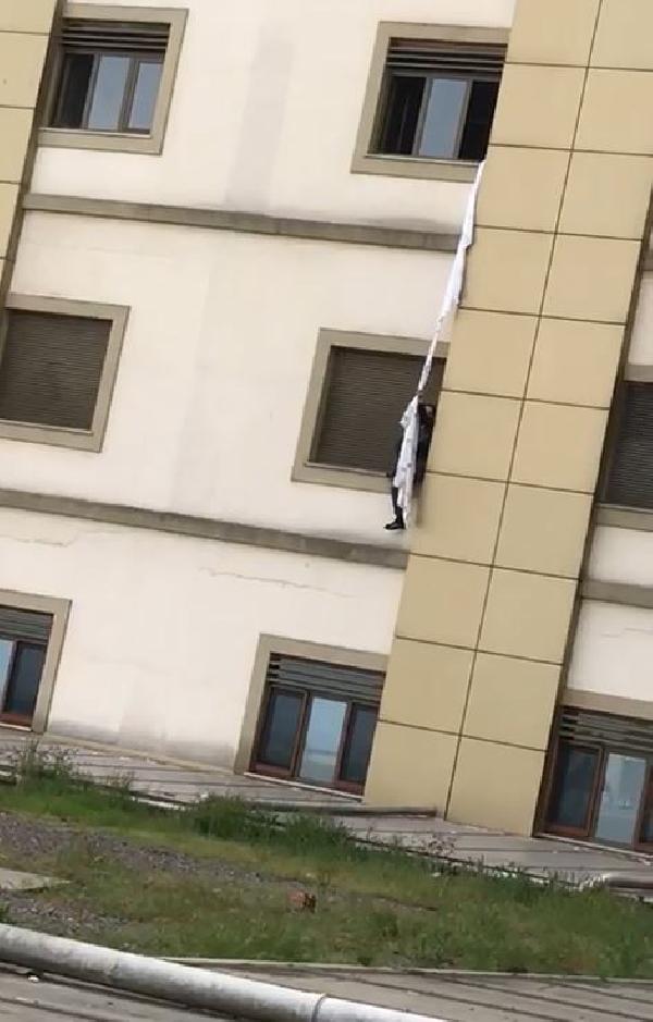 Konstantn Kıaruaklıev’in hastaneden kaçmaya teşebbüs ettiği anları, çevredeki poliklinikte tedavi gören hasta yakınları, cep telefonu kamerasıyla kaydetti. Görüntülerde, yabancı uyruklu kişinin, hastanenin 3’üncü kat penceresinden birbirine bağlayıp, aşağı sarkıttığı çarşafla zemine inmeye çalıştığı, 1’inci katta mahsur kalınca da çevredekilerin ‘Beyefendi, ne yapmaya çalışıyorsunuz. Düşeceksiniz’ diyerek uyarılarda bulunduğu anlar yer alıyor.
