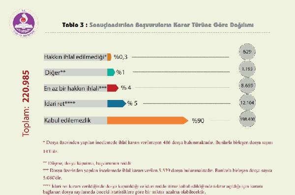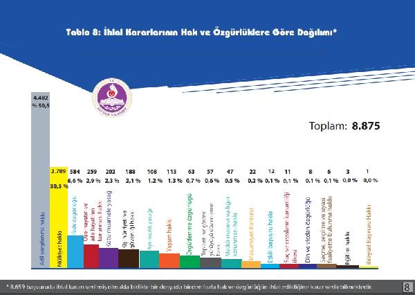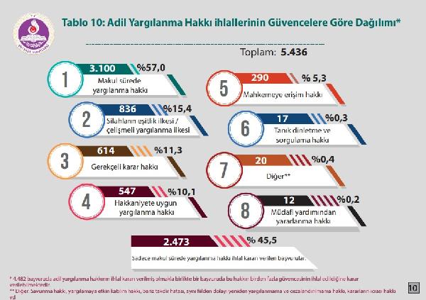 2020’nin üç aylık ilk döneminde verilen hak ihlali kararı ise 292 olarak açıklanırken, bunun 127’sini ‘adil yargılanma hakkı ihlali’ oluşturdu. Mahkemenin sonuçlandırdığı toplam 220 bin 985 başvuru içinde 8 bin 659’u için ‘en az bir hakkın ihlali’ kararı verildi. Toplam ihlal karar sayısı içinde ilk sırayı yüzde 50,5’lik oranla ‘adil yargılanma hakkı’, ikinci sırayı ise yüzde 30,5’lik oranla ‘mülkiyet hakkı’ ihlali aldı. AYM, 4 bin 482 bireysel başvuru için ‘adil yargılanma hakkı’, 2 bin 709 başvuru için ‘mülkiyet hakkı’, 584 başvuru için ‘ifade özgürlüğü’, 259 başvuru için ‘özel hayatın ve aile hayatının korunması hakkı’ ve 202 başvuru için ‘kötü muamele yasağı’ ihlali kararı verdi. ‘Adil yargılanma hakkı’ ihlalinin güvencelere göre dağılımına bakıldığında ise ilk sırayı yüzde 57’lik oran ve 3 bin 100 ihlal kararı ile ‘makul sürede yargılanma hakkı’ alırken, ikinci sırada 836 karar ile ‘silahların eşitlik ilkesi/çelişmeli yargılanma ilkesi’, üçüncü sırada ise 614 karar ile ‘gerekçeli karar hakkı’ ihlali yer aldı.
