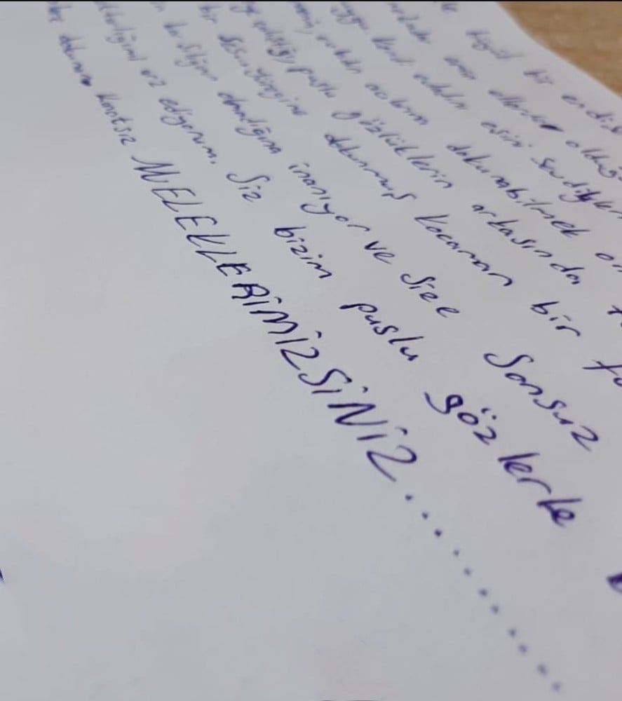 Duygulandıran mektupta yazanlar ise, “Öncelikle büyük bir endişe ve korku ile hastaneye yatıp, daha sonra ne kadar emin ellerde olduğumuzu hissetmek tarifi anlatılmaz bir duygu. Kendi evladını eşini sevdiklerini görememek pahasına, başka bir annenin evladının acılarına dokunabilmek, onlara merhem olup görmeye çalıştığı puslu gözlüklerin arkasında tebessüm eden naif bir ses Yüreğine dokunmuş kocaman bir fedakarlık. Ben bu emeğin karşılığının olmadığına inanıyor ve size sonsuz teşekkürlerimi minnettarlığımı arz ediyorum. Siz bizim puslu gözlerle bakan kalplere dokunan kanatsız meleklerimizsiniz” dedi.