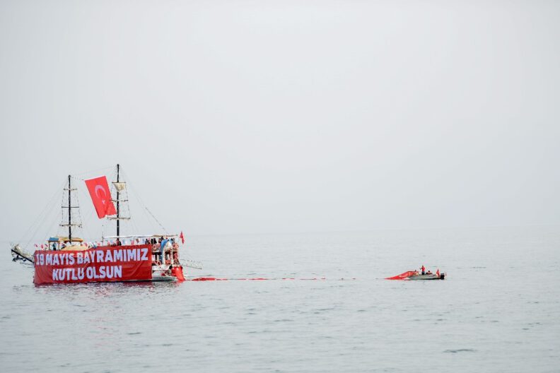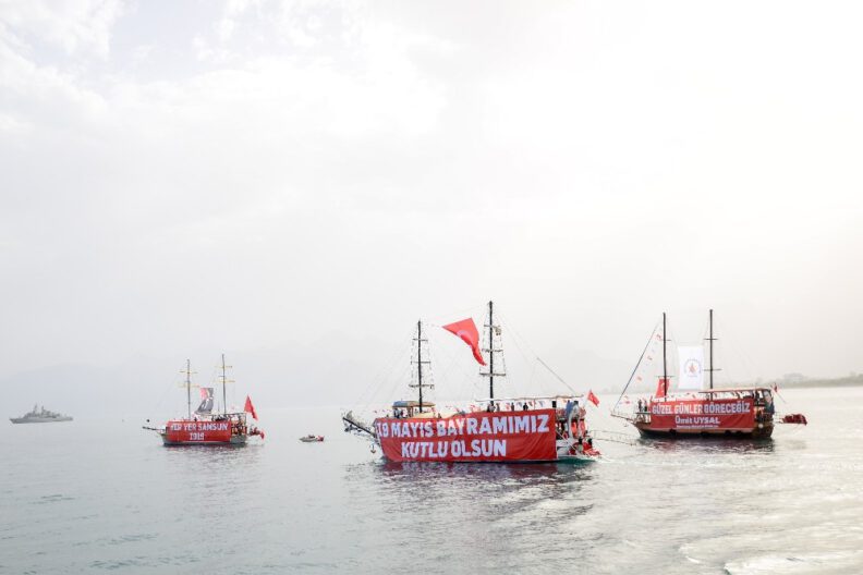 Antalya’da Muratpaşa Belediyesi, 19 Mayıs Atatürk’ü Anma, Gençlik ve Spor Bayramı’nı bu yıl denizden kutladı. Tarihi Kaleiçi yat limanından Türk bayrakları, Atatürk posterleriyle donatılan 3 tekne, Antalya’nın doğa harikası falezler bandı boyunca tur atarak kentin 19 Mayıs’ını kutladı. “19 Mayıs Bayramımız kutlu olsun”, “Her yer Samsun 1919” ve “Güzel günler göreceğiz” yazılı pankartlar asılı tekneler saat 17.30 sularında marşlar eşliğinde Kaleiçi yat limanından demir aldı. Belediye Başkanı Ümit Uysal da teknelerini birine binerken üç tekne yat limanı açıklarında 100 metrelik Türk bayraklarını açtı. Akdeniz, Muratpaşa Belediyesi’nin tekneleriyle 19 Mayıs’ta bambaşka bir görünüme bürünürken Antalyalılar da balkonlarından, yol kenarlarından bayraklar ve meşalelerle tekneleri selamladı.