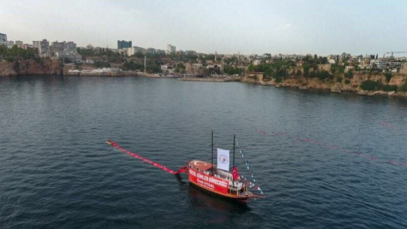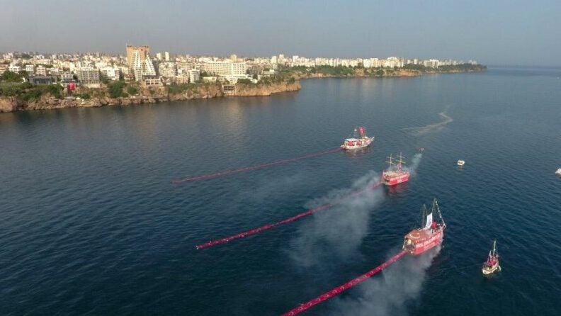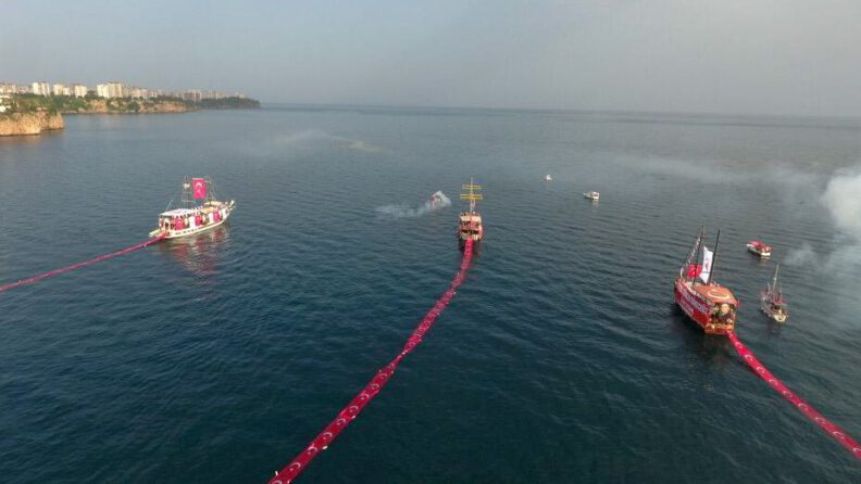 Antalya’da 19 Mayıs Atatürk’ü Anma, Gençlik ve Spor Bayramı kutlamaları kapsamında denizde 3 ayrı tekneden 100’er metre uzunluğunda Türk bayrağı açıldı. Teknelerden yükselen marşlar ve yanan meşalelerle 19 Mayıs kutlanırken Antalyalılar da balkonlarından, yol kenarlarından tekneleri selamladı.