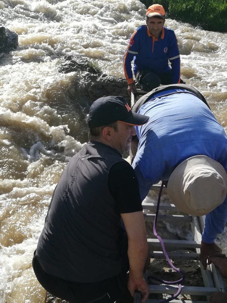 Bölgeye giden AFAD ekibinin başarılı çalışmasıyla her iki dere yatağına merdiven uzatılmak suretiyle pancar toplamaya giden vatandaş kurtarıldı.