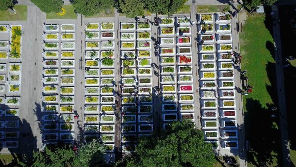 Her bayram olduğu gibi bu Ramazan Bayramı’nın birinci gününde de şehit aileleri ve yakınları Edirnekapı Şehitliği’ni ziyarette bulundu. Edirnekapı Şehitliği’ne gelen şehit aileleri ve yakınları, mezarları temizleyerek çiçeklerini suladı. Şehit aileleri ve yakınları mezar başlarında dualar okudu. Şehitlikteki bayram ziyareti havadan görüntülendi.