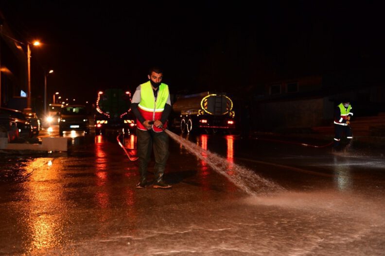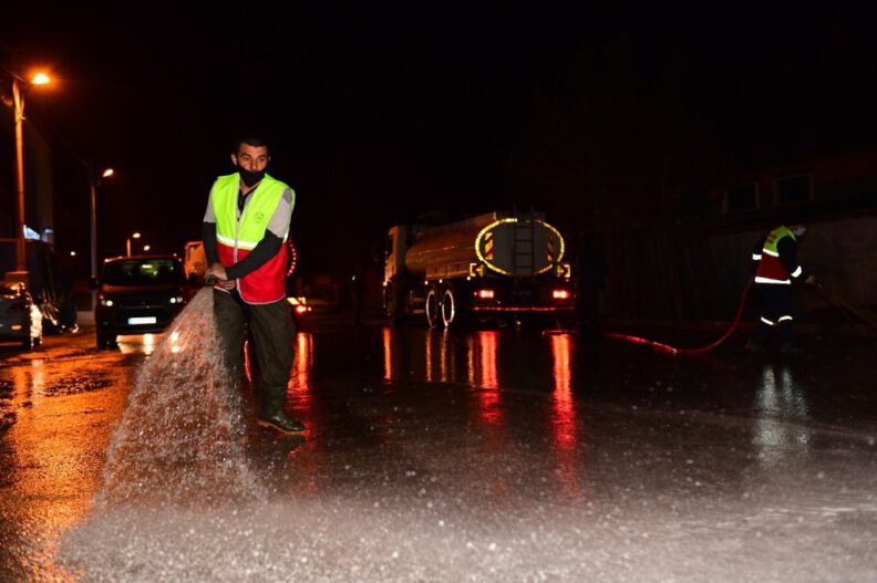 Yakutiye Belediyesi temizlik işleri ekipleri ilçenin cadde ve sokaklarını köpüklü suyla yıkayıp, halkı temiz bir Yakutiye’ye uyandırmak için gece gündüz demeden çalışıyor.