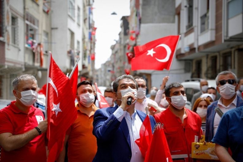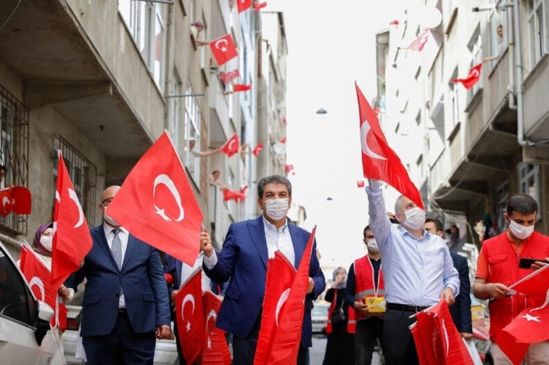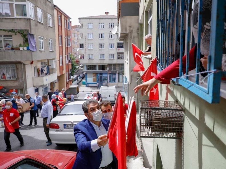 Balkonlarına ve pencerelerine çıkan vatandaşlara seslenen Başkan Göksu, “Esenler’in güzel insanları öncelikle hepinizin Kadir Gecesi’ni tebrik ediyoruz. Gönlümüz isterdi ki bugün meydanlarda olalım. Dedik ki madem meydanlarda olamıyoruz o zaman Esenler’in sokaklarında biz olalım Türk bayrağımızı evlerimize dağıtalım. Bunun hatırası olarak Esenler’in güzel insanları bayraklarını evlerinin balkonlarına assınlar” diye konuştu.