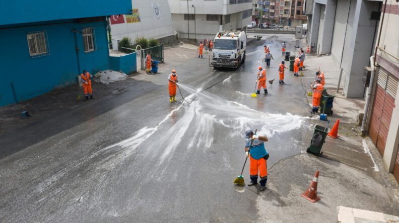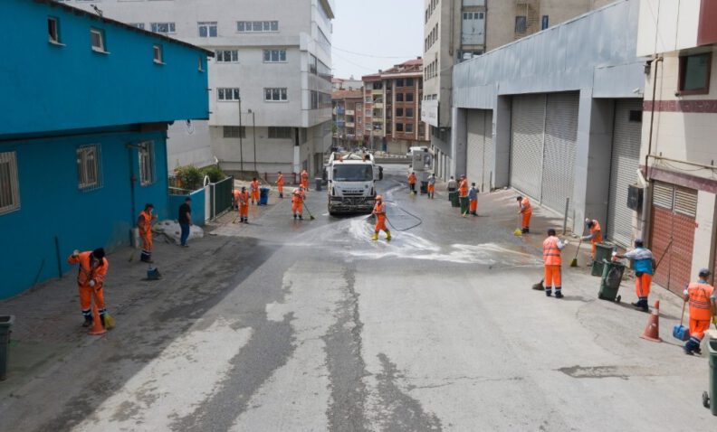 Kaldırımı işgal eden sanayi malzemeleri ekipler tarafından özenle toplandı. Ardından temizlik personelleri kaldırımları titizlikle temizledi. Tanker ve süpürge araçlarıyla yolların yıkaması yapıldı. Ardından Veteriner Hekimliği tarafından yollarda ilaçlama ve dezenfektan çalışması gerçekleştirildi.