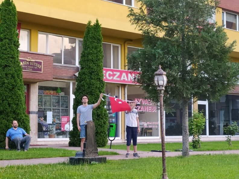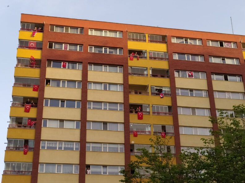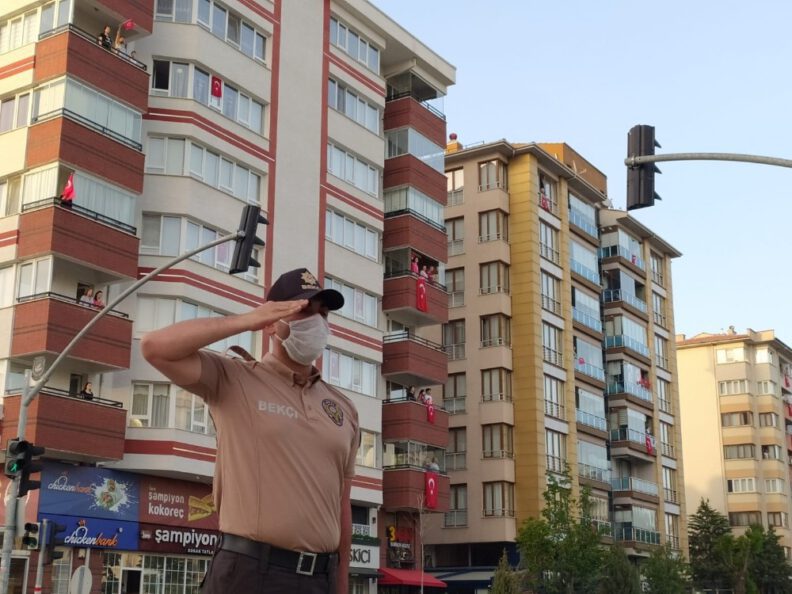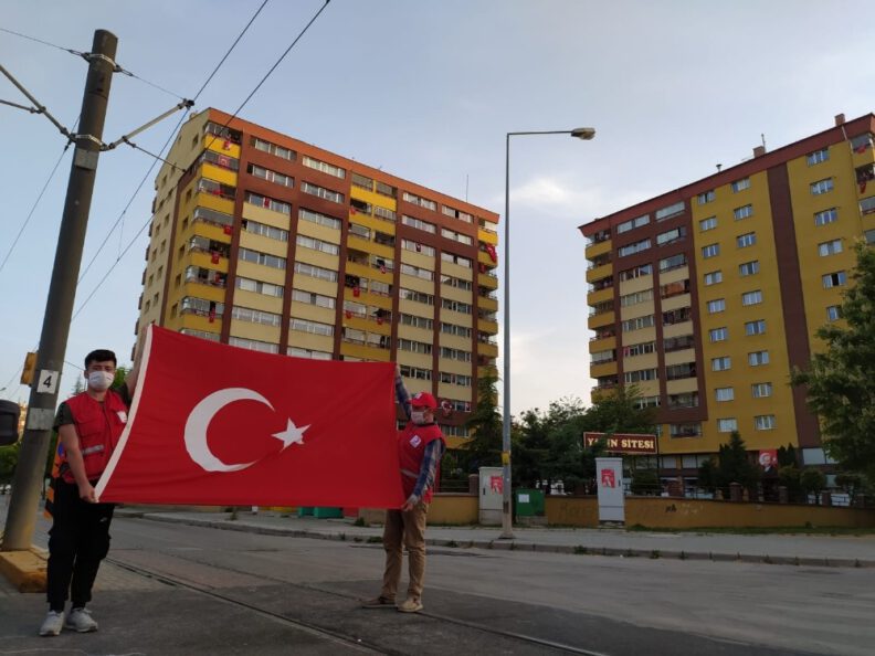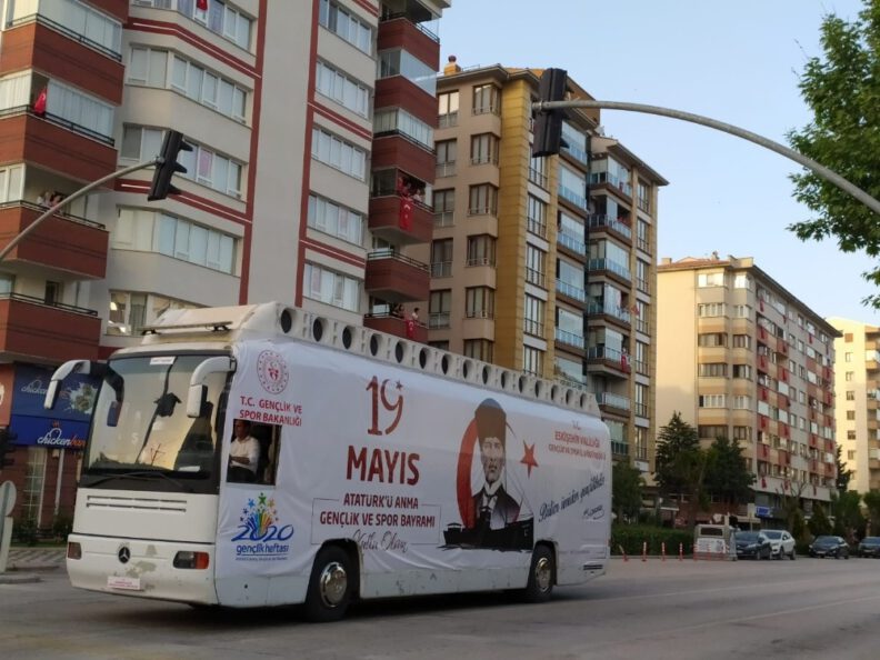 Dün Cumhurbaşkanı Recep Tayyip Erdoğan, “Yarın saat 19.19’da tüm statlarımız aydınlatılarak İstiklal Marşı yayını yapılacaktır. Milletimizi evlerinin pencerelerinden İstiklal Marşı’nı okumaya davet ediyoruz” diye vatandaşlara çağrıda bulunmuştu. Cumhurbaşkanı Erdoğan’ın çağrısının ardından bugün Eskişehir’de iftar öncesi vatandaşlar, saat 19.00 itibarıyla evlerinin balkonlarına ve pencerelerine çıkarak ellerindeki Türk bayraklarını dalgalandırmaya başladı. Ardından Kızılay Eskişehir Şubesi görevlileri araçlarıyla gelerek saat 19.19’da vatandaşların duyabileceği şekilde İstiklal Marşı/nı çaldı. Vatandaşlar, polis ve bekçiler hep bir ağızdan İstiklal Marşı’nı okudu. Vatandaşlar, İstiklal Marşı sonrası hep birlikte alkış tutarak, çalınan şarkılar eşliğinde 19 Mayıs Gençlik ve Spor Bayramı’nı kutladı.