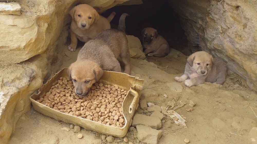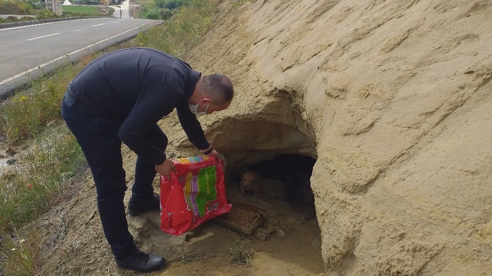 Tekirdağ’ın Süleymanpaşa ilçesinde yolda seyir halinde bir sürücü, yolun hemen kenarında bir grup yavru köpeğin olduğunu fark ederek, aracı durdurdu. Sürücü ve diğer arkadaşları yavru köpeklerin yolun hemen kenarında bulunan bir çukurda doğduklarını fark ederek, minik köpeklerin önüne yem koydular.