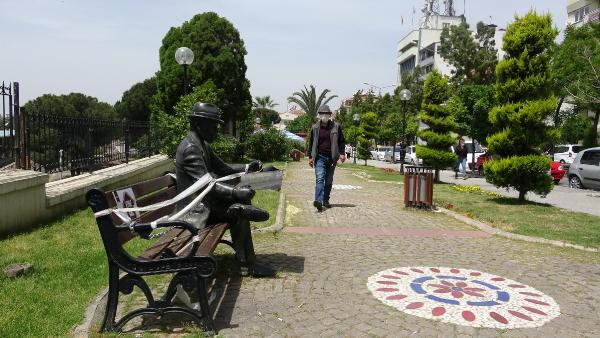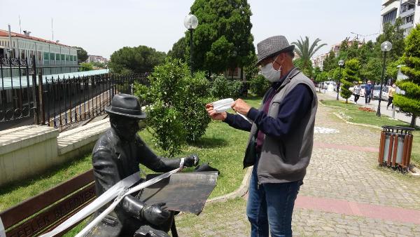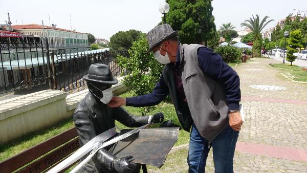 Burhan CEYHAN- Cemal YILDIRIM/AYDIN, (DHA)- AYDIN’ın Efeler ilçesinde, Adnan Menderes Üniversitesi Güzel Sanatlar Fakültesi Öğretim Üyesi Dr. Şükrü Kara (61), koronavirüs salgınında zorunlu olmasına rağmen maske takmayan kişilere dikkat çekmek için, ilçedeki bir meydanda bulunan ve kendisinin gazete okurken tasvir edildiği heykeline maske takıp, poz verdi.