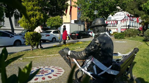 Parkın önünden her geçtiğinde heykelini görünce memnuniyet duyduğunu belirten Şükrü Kara, ilginç bir eyleme imza attı. Koronavirüs salgınında zorunlu olmasına rağmen maske takmayan kişilere dikkat çekmek için, parktaki kendi heykeline cerrahi maske takıp, objektiflere poz verdi.