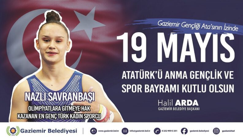 Gaziemir Belediyesi, 19 Mayıs Atatürk’ü Anma, Gençlik ve Spor Bayramı için hazırladığı kutlama afişlerinde sporcularına yer verdi. Belediye, 21 branşta düzenlediği spor kurslarında eğitim gören ve Gaziemir Belediyesi Gençlik ve Spor Kulübü Derneği formasıyla katıldıkları ulusal ve uluslararası turnuvalarda derece kazanan sporcularının fotoğraflarının yer aldığı afişleri ilçedeki ilan panolarına astı. “Gaziemir Gençliği Atası’nın İzinde” sloganının yer aldığı kutlama görsellerinde belediye sporcularının yanı sıra Gaziemirli milli jimnastikçi Nazlı Savranbaşı’nın da fotoğrafı bulunuyor. Almanya’da düzenlenen Artistik Jimnastik Dünya Şampiyonası’nda ülkemizi temsil eden Nazlı Savranbaşı, sergilediği başarılı performansla 2020 Yaz Olimpiyat Oyunları’nda ülkemizi temsil etme hakkı kazanmıştı. Savranbaşı, olimpiyatlara gitmeye hak kazanan en genç Türk kadın sporcu unvanının da sahibi.