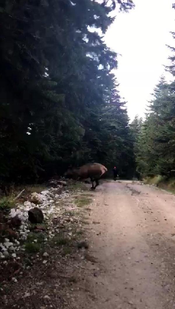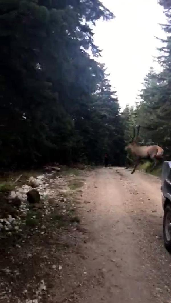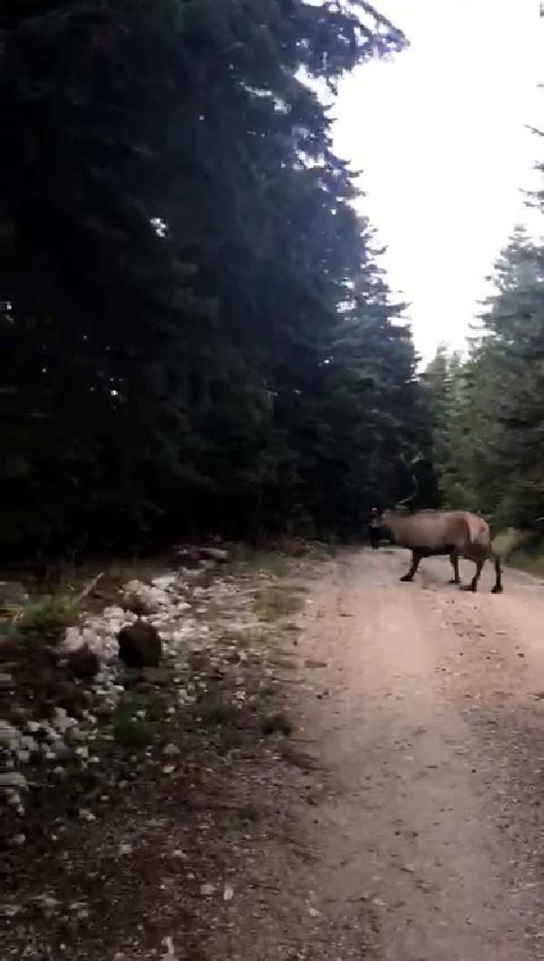 Bolu kent merkezine 30 kilometre uzaklıktaki 1300 rakımlı Aladağlar bölgesinde yaşayan vatandaşlar, köpeklerin huzursuz şekilde havlaması nedeniyle durumu merak edip ormanlık alana, çıktı. Vatandaşlar, yoldan geçtikleri sırada sesler duyarak araçlarından indi. Bu sırada büyük bir geyik yol kenarından atlayarak karşıya geçti. O anlar kameraya yansırken, geyiğin aniden yola fırlayıp atlayarak kaçması videoyu çeken kişide ve yanındakilerde paniğe neden oldu.