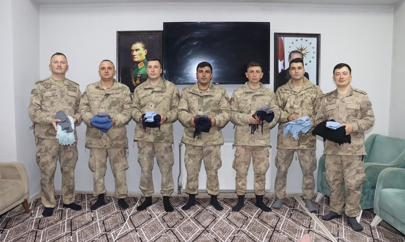 Meryem Nine’nin gönderdiği çorap ve atkılar, Hakkari İl Jandarma Komutanlığı Üs Bölgesinde nöbet tutan jandarmalara dağıtıldı.