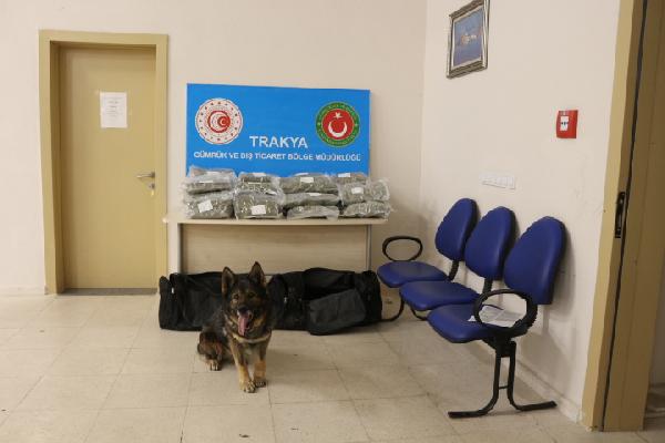 Bakanlıktan yapılan açıklamaya göre, Edirne’de bulunan Hamzabeyli Gümrük Kapısı’ndan Türkiye’ye giriş yapacak TIR, şüpheli değerlendirilerek x-ray tarama cihazına sevk edildi. Yapılan taramada, aracın dorsesinin alt bölümünde şüpheli yoğunluğa rastlandı. Narkotik dedektör köpeğiyle yapılan detaylı aramada, dorsenin altına halatla bağlanan siyah renkli 2 valizin bulunduğu belirlendi. Valizlerde yapılan aramada 39 ayrı şeffaf torba ile paketlenen, toplamda 30 kilogram esrar ele geçirildi. El konulan uyuşturucunun piyasa değerinin yaklaşık 650 bin lira olduğu belirtilirken, sürücü gözaltına alındı.