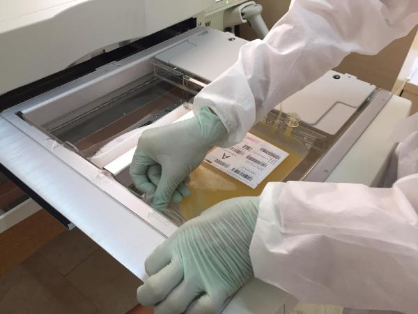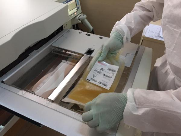 “Buna aferez cihazı deniyor. Aferez cihazından ürünü bir torba içerisinde elde ediyoruz. Onu elde ettikten sonra bağışçı kişi serbestleşiyor ama bizim işimiz devam ediyor. O ürün torbasını alacağız ve bu cihazın içine özel bir bölmeye yerleştireceğiz. Bir solüsyon bu görevi yapacak. Ama önce ultraviyoleye maruz kalıyor ve solüsyon bu şekilde patojeni inaktive edebiliyor. Yaklaşık 7 dakikalık bir işlem. Cihazın kendi bir bölmesi var. Açıp ürünleri yerleştiriyorsunuz. 7 dakika sonra patojen inaktivasyonundan emin olduğunuz bir ürünü alıp isterseniz donduruyor isterseniz hastaya gönderiyorsunuz.”