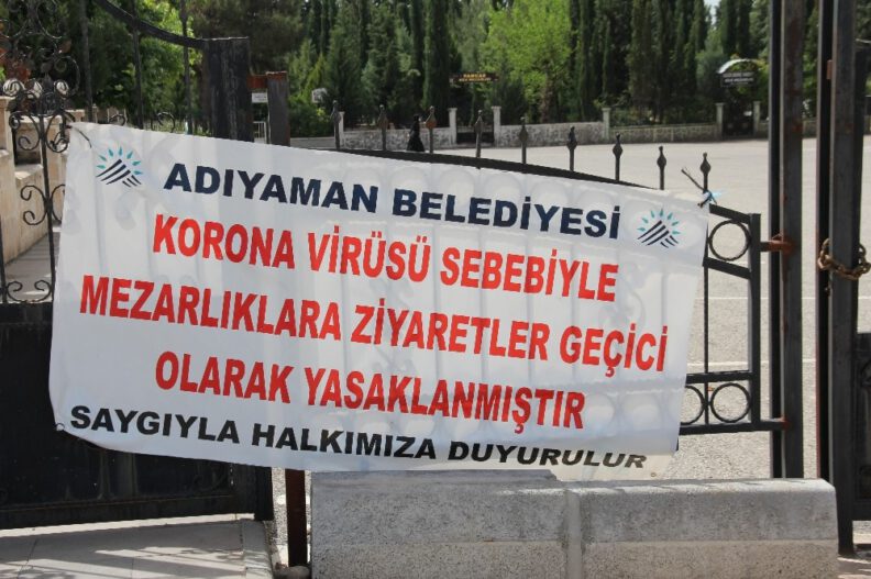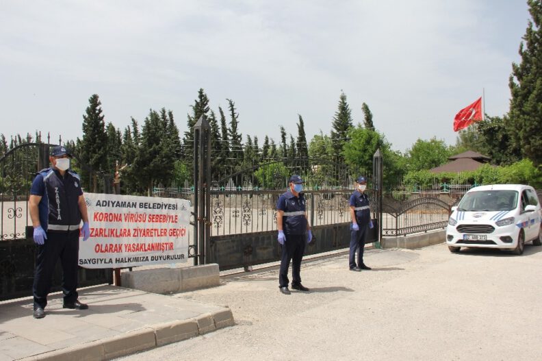 Adıyaman İl Hıfzıssıhha Kurulu, korona virüs (Covid-19) tedbirleri kapsamında mezarlık ziyaretini yasakladı. Kadir Gecesi ve Ramazan Bayramı süresince mezarlıklar ziyaret edilemeyecek. Mezarlık girişine yasak ile ilgili afiş asılırken, zabıta ekipleri mezarlık girişinde bekliyor.