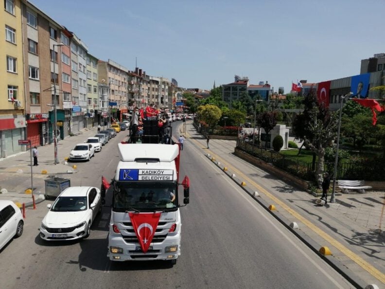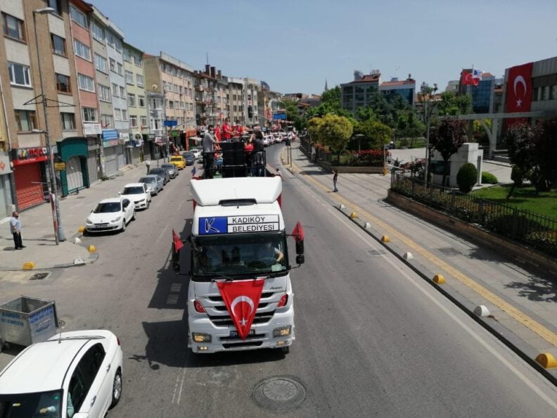 Kadıköy’de 19 Mayıs Atatürk’ü Anma, Gençlik ve Spor Bayramı sokaklarda coşkuyla kutlandı. Bando takımının yer aldığı tır ile ses sistemli araçlar sokakları dolaşarak evlerinde kalan vatandaşlara müzik ziyafeti verdi.