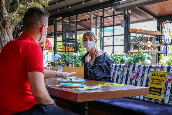 Normalleşme süreciyle birlikte yeniden açılan işletmeler, Sağlık Bakanlığı’nın yayımladığı yönetmelikteki önlemlere göre işyerlerindeki düzeni değiştirdi. Antalya’daki bir işletme ise ‘temassız kafe’ özelliğiyle öne çıktı. Kafeye gelen müşterilerin 60 santimetre arayla ve çapraz şekilde oturmaları için yeni düzenlemeler yapıldı. Müşterilerin ateşleri girişte kurulan ‘yüz istasyonu’ ile ölçülüyor. Sipariş vermek isteyen müşteriler, masalarda bulunan karekodları cep telefonları ile okutarak online sipariş veriyor. Kafedeki diğer hizmetler de aynı şekilde cep telefonu üzerinden sağlanıyor. Bu şekilde tüm sipariş süreci temassız bir şekilde gerçekleştiriliyor. Masalardaki tüm malzemeler ise tek kullanımlık ürünlerden oluşuyor. Müşterinin ayrılmasının ardından masa dezenfekte ediliyor ve bir süre bekletildikten sonra başka bir müşteri alınıyor.