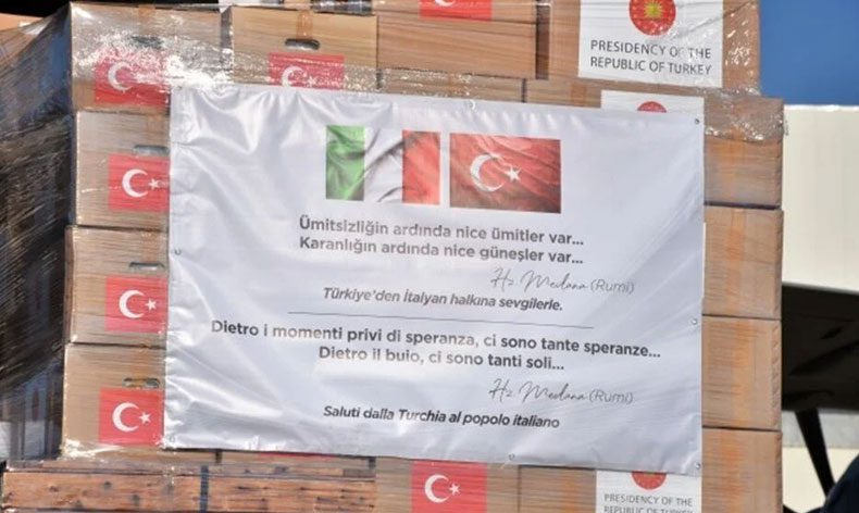 Öte yandan Türkiye’den salgından en çok etkilenen ülkelerden biri olan İtalya’ya gönderilen yardım paketlerinin üzerine İtalyanca ve Türkçe dillerinde Mevlana’nın “Ümitsizliğin ardında nice ümitler var. Karanlığın ardında nice güneşler var” sözüne yer verilmişti.