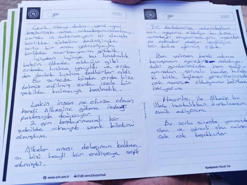 Yurt dışından getirilen vatandaşlardan geriye güzel mektuplar kaldığını ifade eden Sel, “Başta Cumhurbaşkanımıza, bakanlarımıza, yurt çalışanlarına, tüm ekiplere ayırt etmeden teşekkür sunup mektupları bırakıp gitmişler. Duygu dolu mektuplar bırakmışlar. Mesela öğrencimizin odasında çay bulup içmiş, onun parasını bırakıp gitmiş. Öğrenciden, bizden helallik istemiş, zarfın içerisine para bırakmış gitmiş. Bunun gibi çok şeyler oldu. Hatta gittikten sonra bizi hala arayanları oluyor. Kendi memleketlerindeki meşhur olan yöresel ürünleri gönderiyorlar. Geçen gün Çorum’dan leblebi geldi mesela. Sürekli arayıp soruyorlar bizleri, hatta yurda bağışta bulunmak isteyenler bile var. Burada gayet sıcak dostluklar kurduk, çok memnun ayrıldılar” diye konuştu.