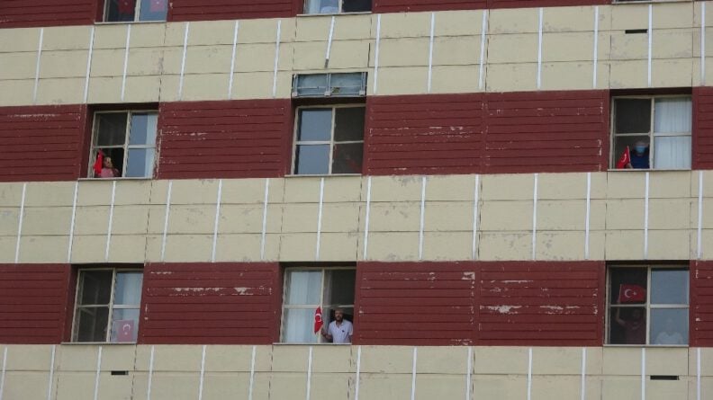 Çanakkale Onsekiz Mart Üniversitesi (ÇOMÜ) Terzioğlu Yerleşkesi’ndeki Kredi ve Yurtlar Kurumuna (KYK) bağlı kız yurdunda karantina altında olan 98 Türk vatandaşı, Sağlık Bakanı Fahrettin Koca’nın çağrısına uyarak saat 19.19’da ellerinde Türk bayraklarıyla camlara çıkarak İstiklal Marşı’nı okudular.