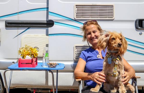 Karavanının önündeki masada kolonya ve bayram şekerini hazır tutan Şükriye Sapmaz, “Kızım yurtdışında yaşıyor, köpeğim yani diğer kızımla bayramımızı burada geçiriyoruz. Sabah komşularımızla bayramlaştık, birbirimize şeker ikram ettik. Sosyal mesafeyi de koruyarak öğleden sonra hep birlikte tatlı yiyeceğiz. Buruk bir bayram oluyor tabi. Doğanın içerisinde karavanda olmak güzel” dedi.
