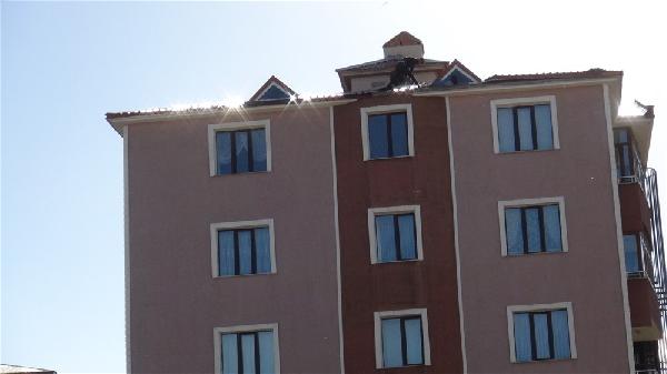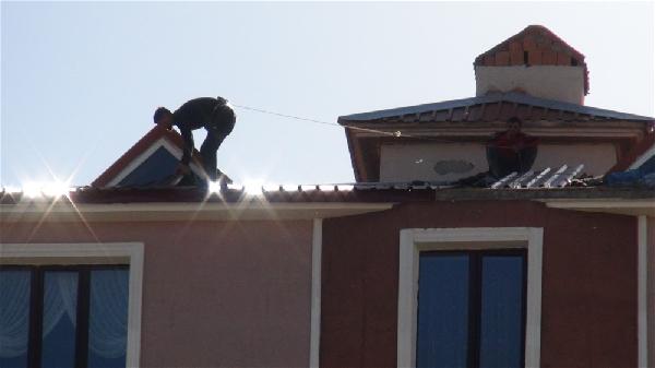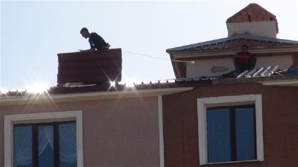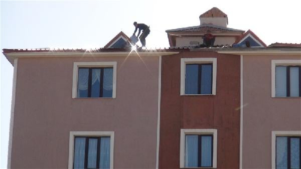 Bedir ALTUNOK/KARS, (DHA) – KARS’ta, 5 katlı apartmanın çatısındaki işçilerin tehlikeli çalışması korkulu anlar yaşattı. Çatı onarımı yapan işçilerden biri, halatla sac çekerken, arkadaşı da onun beline bağladığı iple güvenliğini sağlamaya çalıştı.