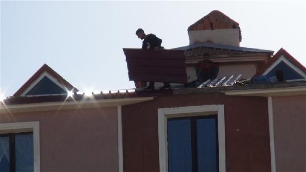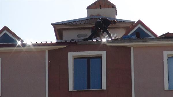 Merkez Yenişehir Mahallesi’nde 5 katlı apartmanın çatısında çalışan işçilerin aldıkları güvenlik tedbiri, yürekleri ağza getirdi. Gazetecilerin kameralarına da yansıyan görüntülere göre, yerden metrelerce yüksekte çalışan işçilerden biri, halatla sac çekerken, arkadaşı da onun beline bağladığı iple güvenliğini sağlamaya çalıştı. İşçilerin iple yaptıkları çalışma, izleyenleri korkuttu. Çatıda bir süre onarım yapan işçiler, herhangi bir kaza olmadan işlerini tamamladı.