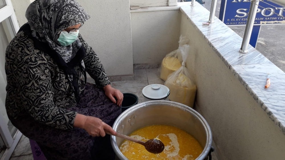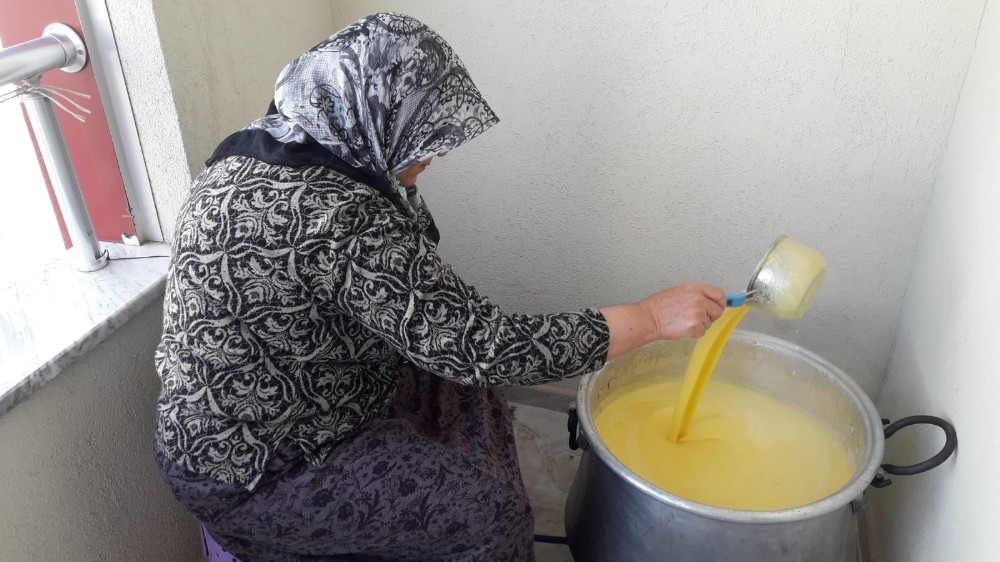 Her yıl Mayıs ayında aldığı tereyağını oğlu ile birlikte evlerinin balkonunda eriten Fatma Erkoç, daha sonra erittiği tereyağından sarıyağ elde ediyor.