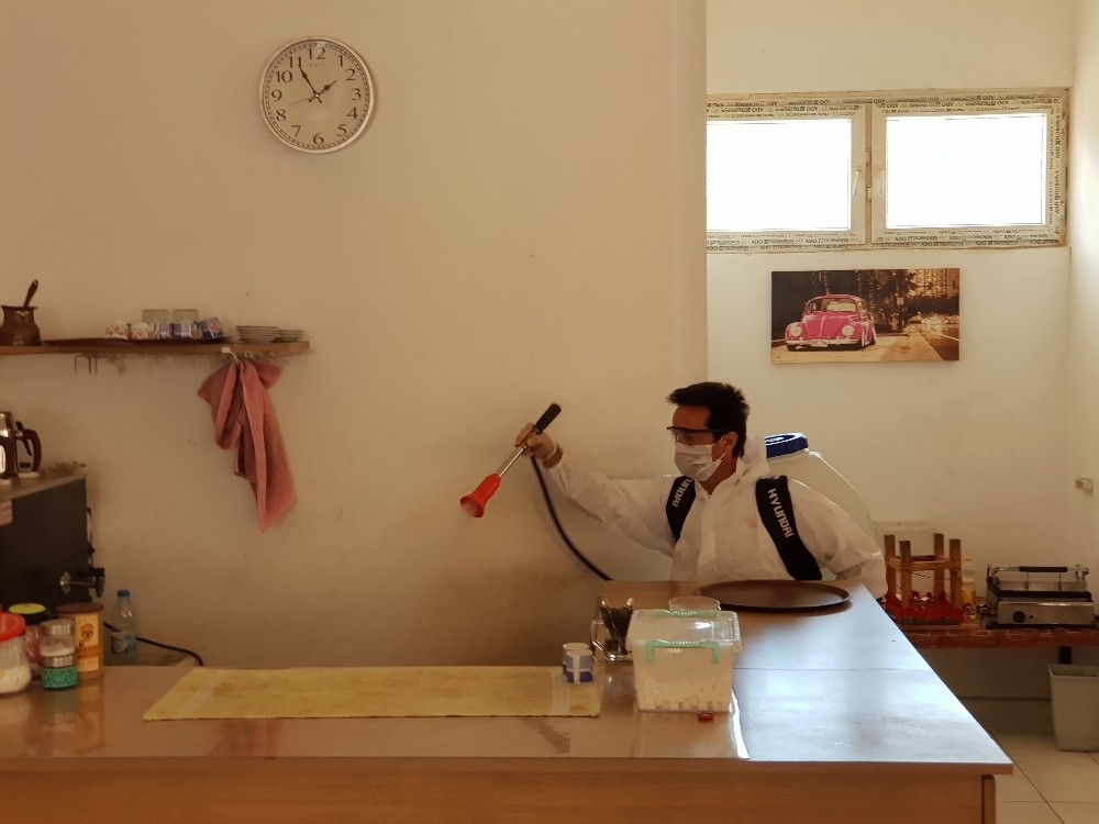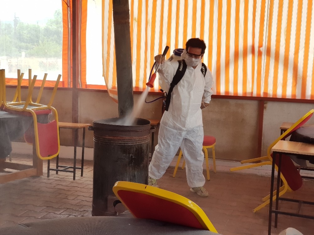 Kemer Belediyesi Park ve Bahçeler Müdürlüğü ekipleri, Kemer’de resmi kurumlar, camiler, park ve bahçeler, otobüsler, duraklar ve yollardan sonra kahvehaneler de dezenfekte işlemi gerçekleştirdi.