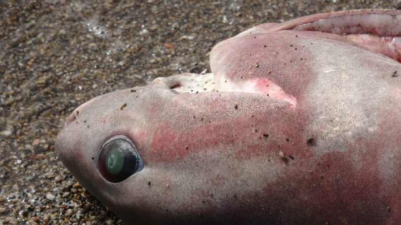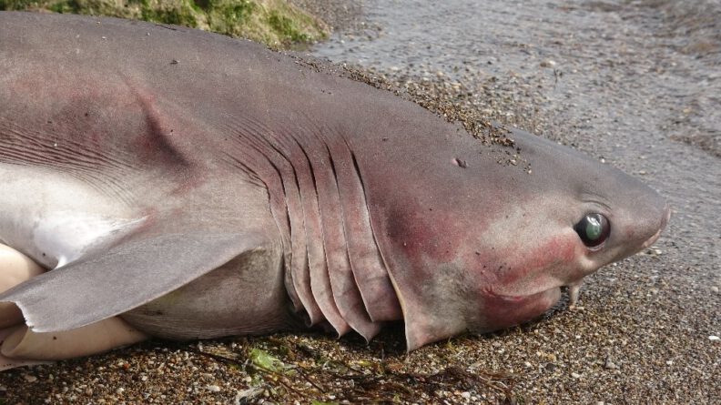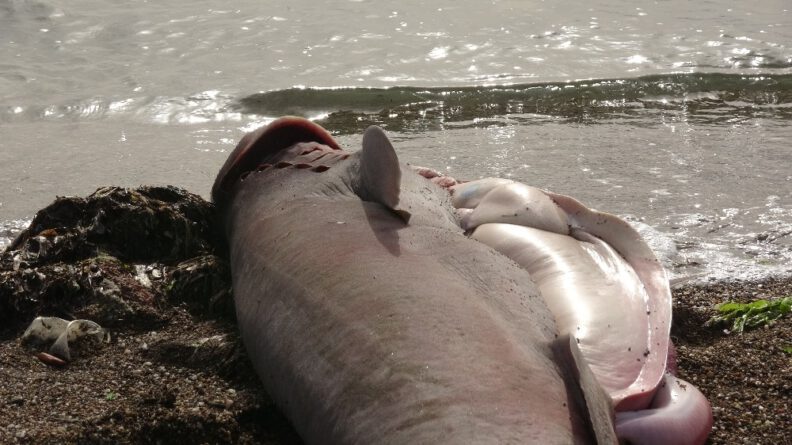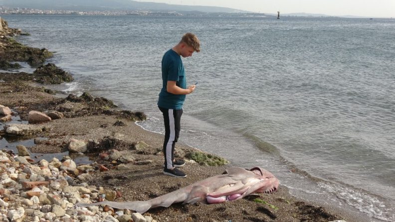 Çanakkale’de altı solungaçlı canavar olarak bilinen boz camgöz türü köpek balığı, ölü olarak sahile vurdu.