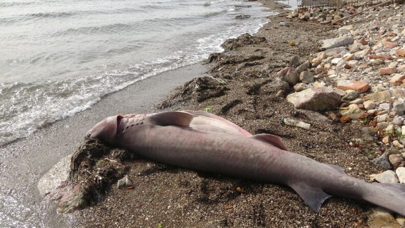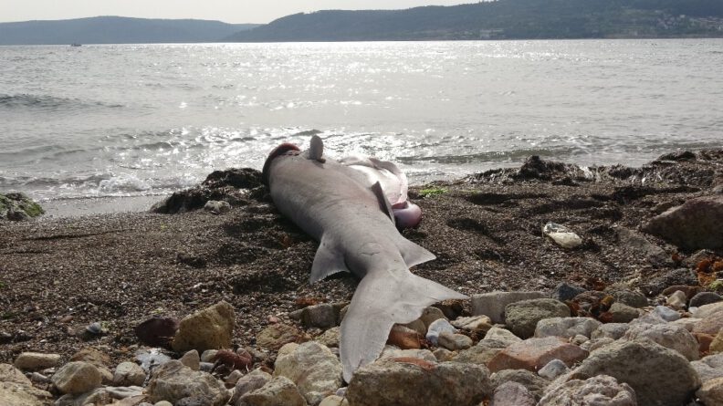 Çanakkale’de akşam saatlerinde sahilde yürüyüş yapan vatandaşlar, kıyıya yaklaşık 1,5 metre uzunluğunda ölü ve boydan boya yarılmış bir köpek balığı vurduğunu gördüler. İlk önce tedirgin olan vatandaşlar, daha sonra ölü köpek balığının fotoğraflarını çektiler. Kısa sürede kokmaya başlayan köpek balığından rahatsız olan vatandaşlar durumu belediye ekiplerine bildirdi.